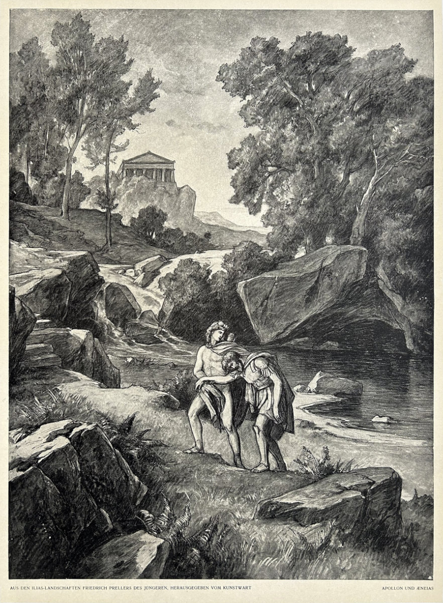 In Greco-Roman mythology, Aeneas was a Trojan hero, the son of the Trojan prince Anchises and the Greek goddess Aphrodite (equivalent to the Roman Venus). His father was a first cousin of King Priam of Troy (both being grandsons of Ilus, founder of Troy), making Aeneas a second cousin to Priam’s children (such as Hector and Paris). He is a minor character in Greek mythology and is mentioned in Homer’s Iliad. Aeneas receives full treatment in Roman mythology, most extensively in Virgil’s Aeneid, where he is cast as an ancestor of Romulus and Remus. He became the first true hero of Rome.