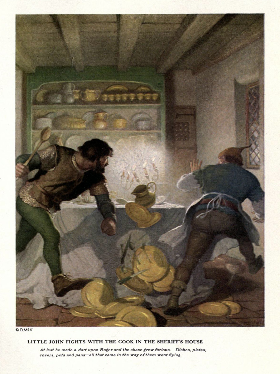 Little John is a companion of Robin Hood who serves as his chief lieutenant and second-in-command of the Merry Men. He is one of only a handful of consistently named characters who relate to Robin Hood and one of the two oldest Merry Men, alongside Much the Miller’s Son. His name is an ironic reference to his giant frame, as he is usually portrayed in legend as a huge warrior – a 7-foot-tall (2.1-metre) master of the quarterstaff. The first known mention of Robin Hood and Little John is found in the Scotichronicon which includes a reference to “the famous murderer, Robin Hood, as well as Little John”. The reference is found, in Latin, under year 1266. Little John appears in the earliest recorded Robin Hood ballads and stories, and in one of the earliest references to Robin Hood by Andrew of Wyntoun in 1420 and by Walter Bower in 1440. In the early tales, Little John is shown to be intelligent and highly capable. In “A Gest of Robyn Hode”, he captures the sorrowful knight and, when Robin Hood decides to pay the knight’s mortgage for him, accompanies him as a servant. In “Robin Hood’s Death”, he is the only one of the Merry Men that Robin takes with him. In the 15th-century ballad commonly called “Robin Hood and the Monk”, Little John leaves in anger after a dispute with Robin. When Robin Hood is captured, it is Little John who plans his leader’s rescue. In thanks, Robin offers Little John leadership of the band, but John refuses. Later depictions of Little John portray him as less cunning. The earliest ballads do not feature an origin story for this character. According to a 17th-century ballad, he was at least seven feet tall and introduced when he tried to prevent Robin from crossing a narrow bridge, whereupon they fought with quarterstaves, and Robin was overcome. Despite having won the duel, John agreed to join his band and fight alongside him. From then on he was called Little John in whimsical reference to his size. This scene is almost always re-enacted in film and television versions of the story. In some modern film versions, Little John loses the duel to Robin.