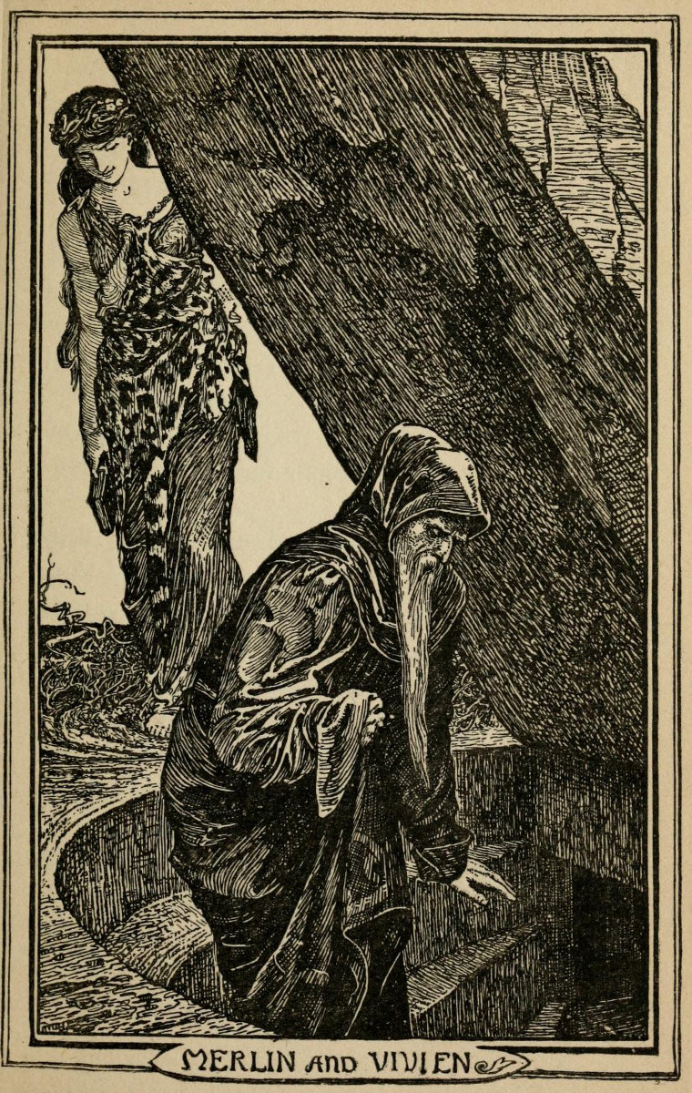 Merlin is a mythical figure prominently featured in the legend of King Arthur and best known as an enchanter or wizard, among his various other roles. His usual depiction, based on an amalgamation of historic and legendary figures, was introduced by the 12th-century British author Geoffrey of Monmouth. It is believed that Geoffrey combined earlier tales of Myrddin and Ambrosius, two legendary Briton prophets with no connection to Arthur, to form the composite figure called Merlinus Ambrosius. Geoffrey’s rendering of the character became immediately popular, especially in Wales Later writers in France and elsewhere expanded the account to produce a fuller image, creating one of the most important figures in the imagination and literature of the Middle Ages. Merlin’s traditional biography casts him as a being born of a mortal woman, sired by an incubus, from whom he inherits his supernatural powers and abilities, most commonly and notably prophecy and shapeshifting. Merlin matures to an ascendant sagehood and engineers the birth of Arthur through magic and intrigue. Later authors have Merlin serve as the king’s advisor and mentor until he disappears from the story after having been bewitched and forever sealed or killed by his student known as the Lady of the Lake after falling madly in love with her, leaving behind a series of prophecies foretelling the events yet to come. He is popularly said to be buried in the magical forest of Brocéliande.