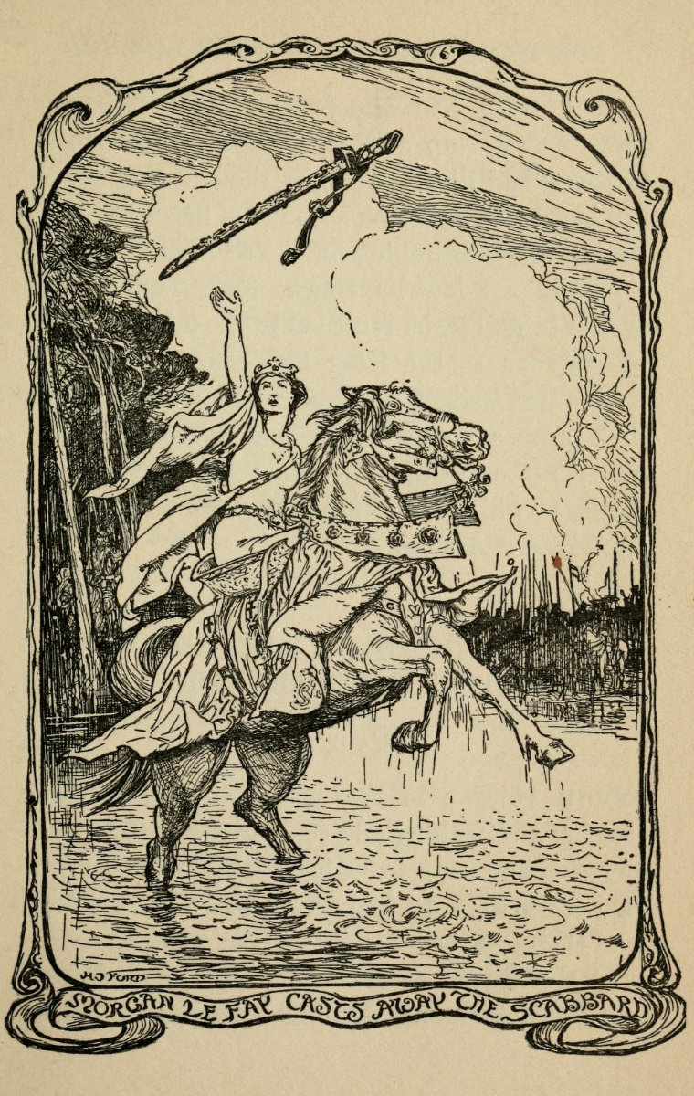 Morgan le Fay (meaning “Morgan the Fairy”), alternatively known as Morgan[n]a, Morgain[a/e], Morg[a]ne, Morgant[e], Morge[i]n, and Morgue[in] among other names and spellings, is a powerful and ambiguous enchantress from the legend of King Arthur, in which most often she and he are siblings. Early appearances of Morgan in Arthurian literature do not elaborate her character beyond her role as a goddess, a fay, a witch, or a sorceress, generally benevolent and connected to Arthur as his magical saviour and protector. Her prominence increased as legends developed over time, as did her moral ambivalence, and in some texts there is an evolutionary transformation of her to an antagonist, particularly as portrayed in cyclical prose such as the Lancelot-Grail and the Post-Vulgate Cycle. A significant aspect in many of Morgan’s medieval and later iterations is the unpredictable duality of her nature, with potential for both good and evil. Her character may have originated from Welsh mythology as well as from other ancient myths and historical figures. The earliest documented account, by Geoffrey of Monmouth in Vita Merlini (written c. 1150) refers to Morgan in conjunction with the Isle of Apples (Avalon), to which Arthur was carried after having been fatally wounded at the Battle of Camlann, as the leader of the nine magical sisters unrelated to Arthur. Therein, and in the early chivalric romances by Chrétien de Troyes and others, Morgan’s chief role is that of a great healer. Several of numerous and often unnamed fairy-mistress and maiden-temptress characters found through the Arthurian romance genre may also be considered as appearances of Morgan in her different aspects. Romance authors of the late 12th century establish her as Arthur’s supernatural elder sister. In the early 13th-century, Robert de Boron-derived Arthurian prose cycles — and the later works based on them in turn, including among them Thomas Malory’s influential Le Morte d’Arthur — Morgan is usually described as the youngest daughter of Arthur’s mother, Igraine, and of her first husband, Gorlois. Arthur, son of Igraine and Uther, is thus Morgan’s half-brother; the Queen of Orkney is one of Morgan’s sisters and Mordred’s mother. Morgan unhappily marries Urien, with whom she has a son, Yvain. She becomes an apprentice of Merlin, and a capricious and vindictive adversary of some knights of the Round Table, all the while harbouring a special hatred for Arthur’s wife Guinevere. In this tradition, she is also sexually active and even predatory, taking numerous lovers that may include Merlin and Accolon, with an unrequited love for Lancelot. In some variants, including in the popular retelling by Malory, Morgan is the greatest enemy of Arthur, scheming to usurp his throne and indirectly becoming an instrument of his death; however, she eventually reconciles with Arthur, retaining her original role of taking him on his final journey to Avalon. Many other medieval and Renaissance works feature continuations of her evolutionary tale from the aftermath of Camlann as she becomes the immortal queen of Avalon in both Arthurian and non-Arthurian stories, sometimes alongside Arthur. After a period of being largely absent from contemporary culture, Morgan’s character again rose to prominence in the 20th and 21st centuries, appearing in a wide variety of roles and portrayals. Notably, her modern character is frequently being conflated with her sister’s as mother of Arthur’s son and nemesis Mordred, the status that Morgan herself has never had in medieval legend.