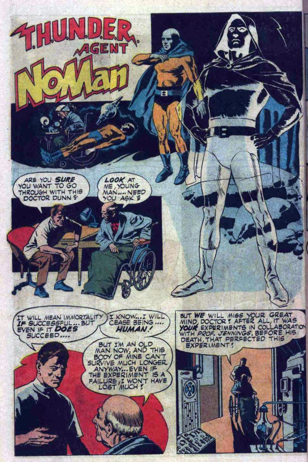 Anthony Dunn was a scientist and employee of T.H.U.N.D.E.R. who sought to escape his aged body and become immortal by transferring his consciousness into the “electrical impulses” of an android brain. This consciousness could also switch between different bodies at will. Nor was this his only power, for T.H.U.N.D.E.R. gave him an invisibility cloak invented by the late Professor Jennings, once a colleague and collaborator of Dunn. He took on the name of NoMan and became a founding member of the T.H.U.N.D.E.R. Agents. NoMan’s bodies are vastly complex machines which cost millions of dollars each to make. They are far closer to organic bodies than those of a typical robot. They apparently need to breathe. NoMan is seen wearing space suits several times. Given NoMan’s intense romantic attractions, may have been “fully functional,” as well. However, the suits displayed a resistance to knockout gas and the mind-controlling drugs of the Tarantula. They possess superhuman strength, though not on the level of Dynamo. If one of his bodies is destroyed, NoMan can survive as long as there is another body within range to transmit his consciousness into. He can only inhabit one body at a time. In several cases, NoMan used specially-built bodies modeled after others for infiltration missions. In less significant missions, he sometimes disguised himself with a strangely realistic rubber or plastic mask. Though he has many bodies, NoMan only has one cloak, and he has often had to fight to recover it… Enemies of NoMan include Paschke, Demo and the Image. Notes: Tower Comics never registered its titles with the US copyright office and also did not include a correct copyright notice on their books. According to US copyright law all works published between 1923-1977 that did not comply with copyright law became public domain upon publication. Also the copyright notice on the first issues of T.H.U.N.D.E.R. Agents and NoMan were not in the proper location of the book which under copyright law at the time it was published must be “either upon the title page or upon the first page of text of each separate number or under the title heading.” Secondly, they were hidden in the artwork which goes against this “The notice should be permanently legible to an ordinary user of the work under normal conditions of use and should not be concealed from view upon reasonable examination.” So, the first issue had an incorrect notice and the characters fell into the public domain.