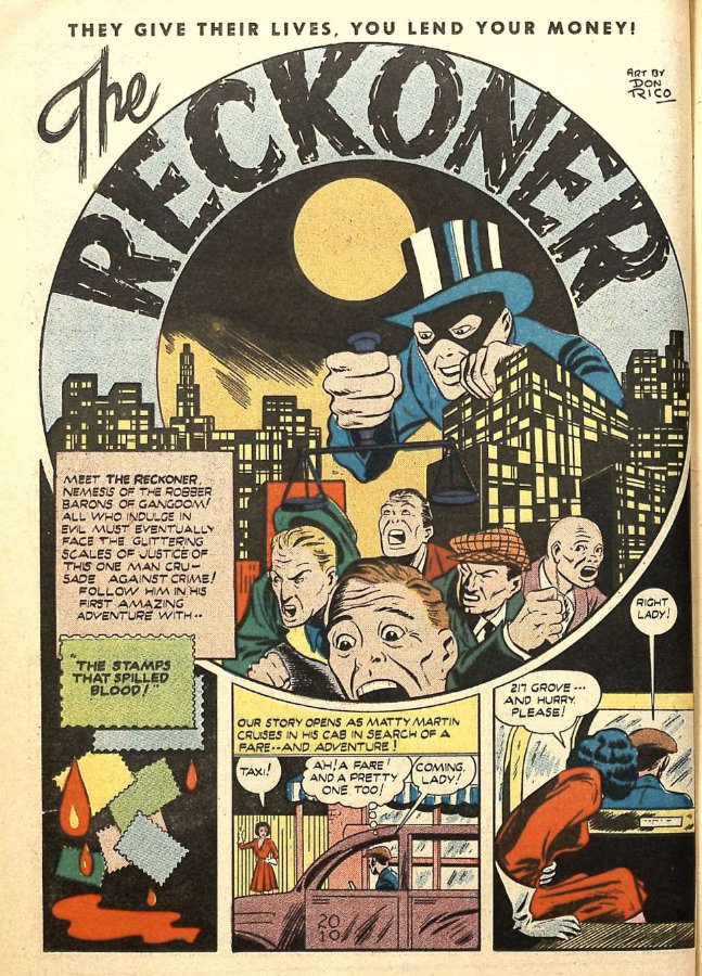 A cab driver named Matty Martin (or, depending on the story, Michael Shayne) becomes the costumed crime-fighter Reckoner. He wears a top hat, cloak, and sometimes a black mask. None of the stories ever explained what prompted him to do this in the first place. Rocky, an orphaned boy he met during his first (published) adventure, becomes his sidekick Chipper. Reckoner had no powers, but was a good detective, and skilled with his fists.