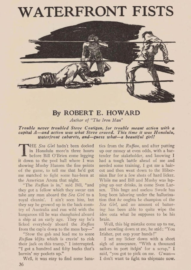 Sailor Steve Costigan is a merchant sailor on the Sea Girl and is also its champion boxer. His only true companion is a bulldog named Mike, named after his brother and fellow boxer, “Iron” Mike Costigan. Costigan, one of Robert E. Howard’s humorous boxing pulp heroes, roamed the Asiatic seas with fists of steel, a will of iron, and a head of wood. He is an Irish American from Galveston, Texas, a heavyweight boxer, weighing 190 lb and standing 6 ft (1.8 m) tall. He has the “Black Irish” combination of blue eyes and black hair. The Sailor Steve Costigan stories were very popular in the pages of Fight Stories, Action Stories, and the short-lived Jack Dempsey’s Fight Magazine. Howard used understatement and misdirection to create humor. He established Costigan as a most unreliable narrator, a sailor who cannot admit when he has had a lot to drink, does not realize he is a terrible judge of character, and acts before he thinks. Told in a jaunty first-person style and in the past tense, the Costigan stories are presented in a slang-riddled, colloquial fashion. Costigan and Dennis Dorgan, renamed for a different publication, are the same character, acting, speaking, and fighting in exactly the same way.