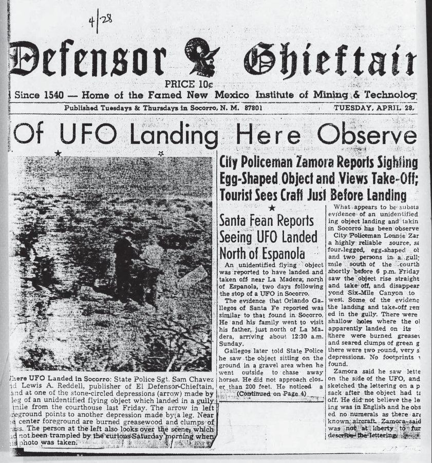 From the Project Blue Book report written by Eric T. de Jonckheere, Colonel, USAF: “a. At appoximately 1745, 24 Apr 64, while giving chase to a car in Socorro, Mr Lonnie Zamora heard what he believed to be a roar and saw a flame in the sky to the southeast, approximately one half mile away. Mr zamora, a policeman for the Socorro Police Department, believed that a dynamite shack in the area had blown up and decided to go to the shack and not pursue the speeding automobile. b. Mr zamora claims that the flame WaS bluish and sort of orange in color. However, he could not tell the size of the flame which was slowly descending. The flame was of a narrow type and streamed down into sort of a funnel shape. At this time he was still driving his car and did not pay too much attention. c. Mr Zamora traveled slowly on the gravel road westward toward the object. He noted nothing for a while and he went slowly looking for the shack; he could not recall exactly Where the shack was located. He suddenly noted to the south of his position a shiny object vhich was off the road. At first glance it appeared as a car upside down. He thought some kids might have turned it over. At this point he saw two people in white coveralls, quite close to the object. One of these persons seemed to stop and look straight at him and seemed startled. At this point Mr Zamora was traveling with the idea of helping them. The object was like aluminum-white, smooth, but not like chrome. Object was oval shape and at first glance appeared to look like an overturned white automobile. The only time that Mr Zamora saw the two people in white coveralls was when he stopped, probably two seconds or so. The two persons appeared to be normal in shape. At this point Mr zamora proceeded towards the object and radioed the sheriff’s office at Socorro of a possible accident. He informed the Socorro office that he would be busy and out of his car, checking the object. d. Mr Zamora stopped his car while he was still talking on the radio and started to get out. He finished his conversation with the sheriff’s office and proceeded towards where the object was. He then heard a roar, a very loud roar but not like a jet, which was of low frequency and then rose in frequency and very very loud. At the same time that the roar was heard be saw a flame. The flame was under the object. Object started to go straight up, slowly. Object rose slowly and flame was coming from the bottom. The color was light blue and sort of orange, but he saw no smoke. However, there was dust in the immediate area. As soon as Mr zamora saw the flame and heard the roar he turned and ran away from the object. He bumped his leg on the back fender of his auto, lost his glasses, fell to the ground, got up and proceeded away from the object for at least another 50 feet. He fell to the ground and covered himself like an ostrich, expecting the object to blow up. The roar lasted for a few seconds. e. When there was complete silence, he lifted his head and saw the object going away from him. The object appeared to go straight up to an altitude of 15 feet and proceed slowly towards the dynamite shack where it cleared the shack by what appeared to be three feet. Object traveled six miles in three minutes. f. Mr Zamora went back to his car and asked the radio operator at the station to look out the window and see if he could spot the object. The radio operator failed to spot the object because he was facing North and could not see the object from this angle. g. Mr Zamora claims that the object had no flame whatsoever as it was flying over the ground and he could see no smoke. h. After the object had left the area, Sgt Chaves, of the New Mexico State Patrol, arrived at the scene. Sgt Chaves claims that Mr Zamora was perspiring and very white, very pale. Sgt Chaves and Mr Zamora saw a burning brush and proceeded to the spot where the object had first been seen. i. Mr Zamora claims that the object had two legs slanted outwards towards the ground and he also claims that he distinctly heard two or three loud thumps, like someone possibly shutting or opening a door. 2. It is my belief that Mr Zamora is telling the truth and that hee did in fact see a man made object which probably belongs to one of the services. There is no indication that this vehicle which Mr Zamora saw came trcm outer space, now or ever.”