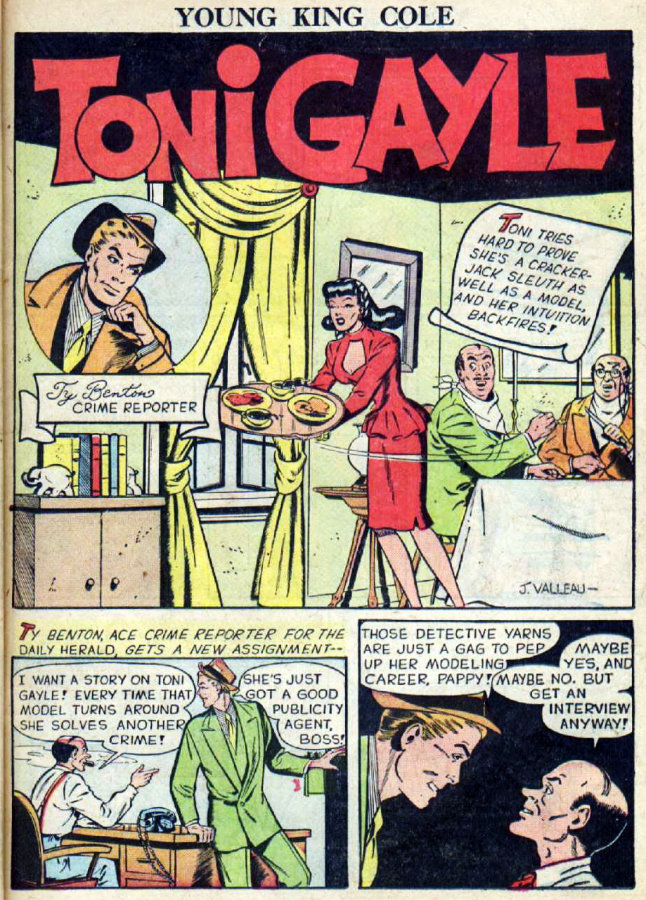 Toni Gayle (later “Toni Gay”) was the daughter of Gregory Gayle, a famed police detective. She was always a clever girl, but her father didn’t want her to have anything to do with police work, so she went into modeling. When a murderer known as the Ape severely injured her father, Toni investigated. She brought the Ape to justice. From then on, Toni split her time between modeling and crime-fighting, along with occasional acting jobs. Toni was assisted by Biff Muggson, a reformed criminal her father once helped put away. Biff served as a bodyguard, but Toni was more than capable of defending herself when he wasn’t around. When Star Publications acquired Novelty Press’ assets, Toni became one of the features in School Day Romances, a title that mostly featured high school and college-aged girls. Toni stopped investigating crimes and focused on modeling. Biff vanished and a new supporting cast developed around her. She found a boyfriend in Butch Dykeman, a struggling actor, and an enemy in Eve Ardor, a fellow model.